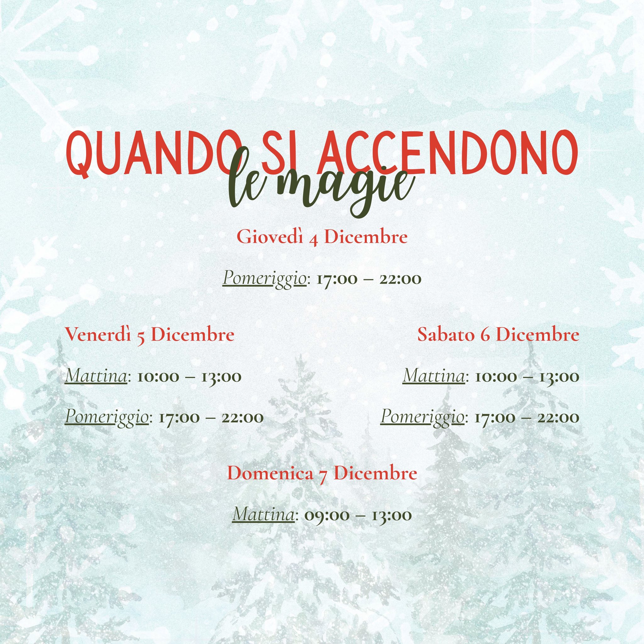 Le attività si svolgeranno giovedì 4 dicembre dalle 17:00 alle 22:00; venerdì 5 e sabato 6 sia al mattino, dalle 10:00 alle 13:00, sia al pomeriggio, dalle 17:00 alle 22:00; mentre domenica 7 dicembre l’evento aprirà dalle 09:00 alle 13:00.