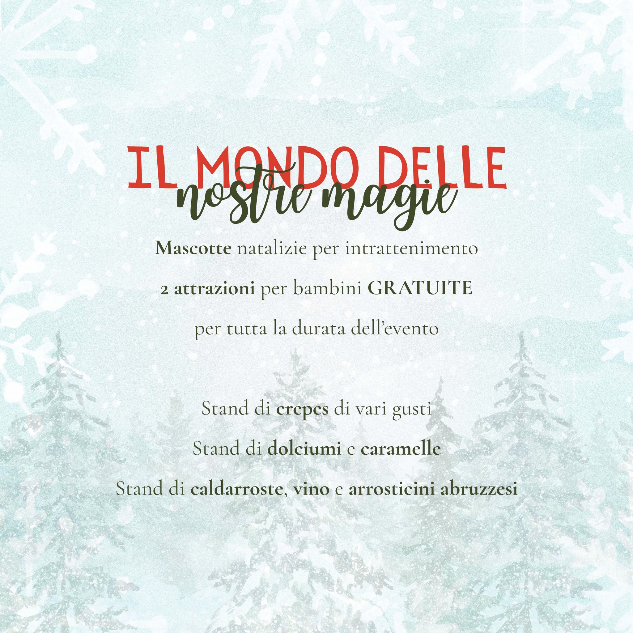 Durante l’evento non mancheranno mascotte natalizie e due attrazioni gratuite per bambini, disponibili per tutta la durata della manifestazione. Ad arricchire il percorso ci saranno inoltre stand gastronomici con crêpes di vari gusti, dolciumi e caramelle, insieme a specialità come caldarroste, vino e arrosticini abruzzesi, pronti a deliziare ogni palato.