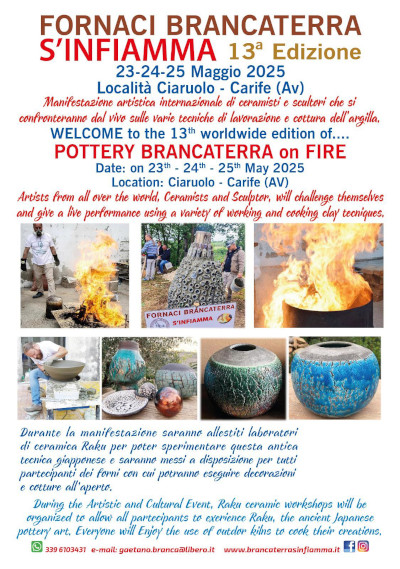 "Fornaci Brancaterra S'Infiamma" ravviverà Carife nei giorni di Venerdì 23, Sabato 24 e Domenica 25 Maggio. Appuntamento in località Ciaruolo per la tredicesima edizione della manifestazione artistica internazionale. Nasce da un’idea del maestro ceramista e direttore artistico Gaetano Branca. Ceramisti e scultori si confrontano dal vivo sulle varie tecniche di cottura e lavorazione dell’argilla mostrando ai partecipanti le interessanti fasi di costruzione di forni per cotture sperimentali dando loro la possibilità di partecipare allo svolgimento delle attività attraverso corsi dedicati a diversi campi artistici. Ceramica e scultura si fondono tra le fiamme.