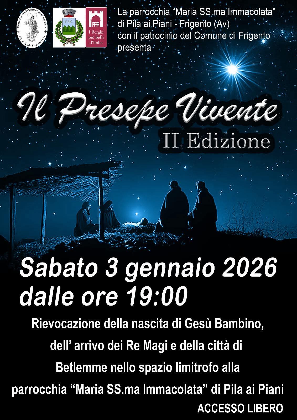L’iniziativa, promossa dalla Parrocchia “Maria Santissima Immacolata” di Pila ai Piani, con il patrocinio del comune di Frigento, si svolgerà sabato 3 gennaio 2026 a partire dalle ore 19:00, in uno scenario notturno che richiama l’atmosfera solenne e contemplativa della Natività. La rappresentazione sarà ospitata nello spazio limitrofo alla parrocchia, trasformato per l’occasione in un vero e proprio villaggio di Betlemme.