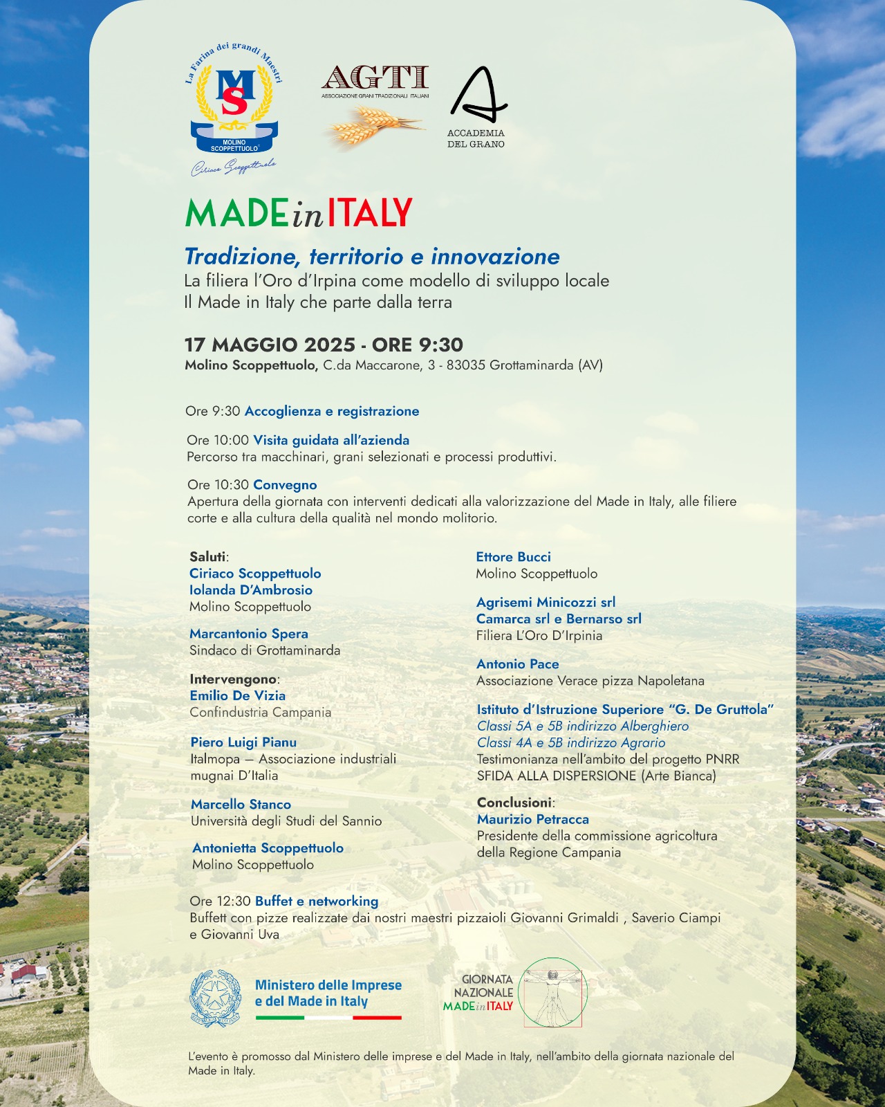 Tradizione, territorio e innovazione si incontrano per celebrare il Made in Italy che parte dalla terra. Molino Scoppettuolo presenta la filiera 'L’Oro d’Irpinia' come modello di sviluppo locale in un evento che si terrà sabato 17 maggio, a partire dalle 9.30, presso la sede aziendale in Contrada Maccarone, a Grottaminarda.