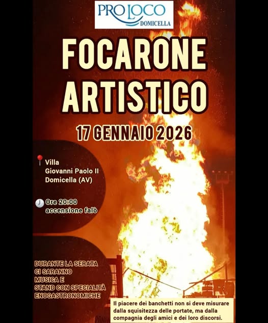 A Domicella il suggestivo Focarone Artistico dell’inverno, in programma sabato 17 gennaio presso la Villa Giovanni Paolo II. L’evento, organizzato dalla Pro Loco di Domicella, rappresenta un appuntamento molto atteso, capace di unire tradizione, spettacolo e convivialità.