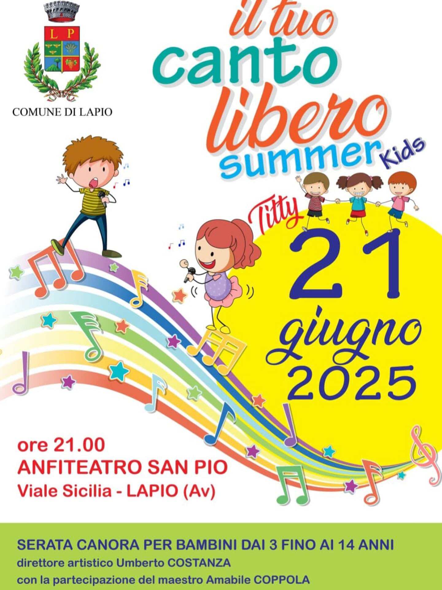 Sabato 21 giugno alle ore 21:00 l’Anfiteatro San Pio, in viale Sicilia a Lapio, ospiterà 'Il tuo canto libero Summer Kids', una serata canora interamente dedicata ai bambini dai 3 ai 14 anni.