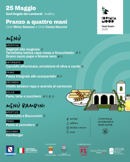 Opzione 2 - Pranzo a cura di Irpinia Mood, a quattro mani, con lo chef Mirko Balzano e la chef Cinzia Mancini, ideato e preparato in dialogo con il tema dell’edizione 2025 “cibo sovrano”. È previsto anche il menù bambini, per vivere l’esperienza in famiglia