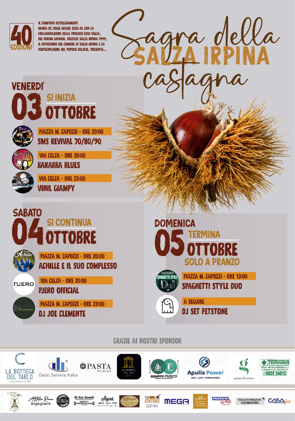La 40ª Sagra della Castagna, in programma il 3, 4 e 5 ottobre nel cuore del suggestivo borgo di Salza Irpina, è organizzata dal Comitato Festa Maria SS. delle Grazie 2025/2026, con il sostegno della comunità salzese, delle associazioni locali e il patrocinio dell’Amministrazione Comunale.