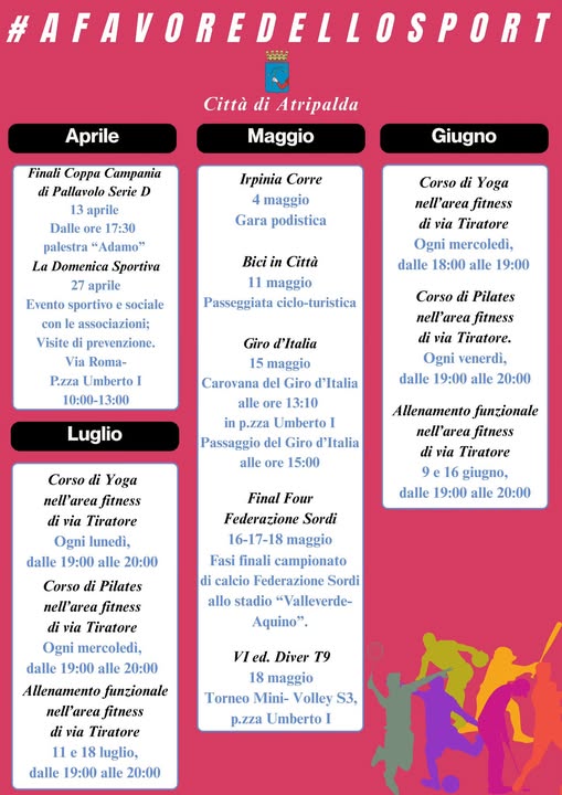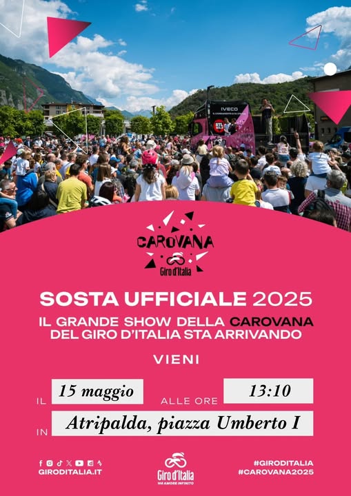 Giovedì 15 maggio Atripalda torna a vestirsi di rosa, con il serpente della Carovana pubblicitaria del Giro d'Italia, colore, gioia e divertimento coinvolgeranno il pubblico del ciclismo.