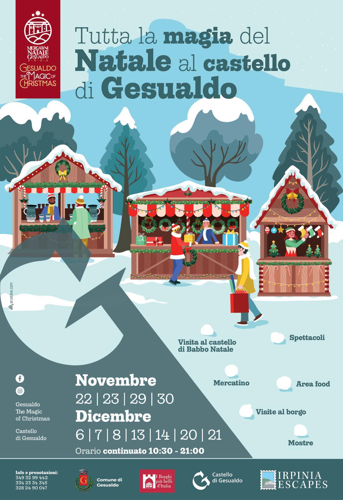 Nel borgo di Gesualdo il Natale prende vita tra luci scintillanti, atmosfere suggestive e scorci che sembrano usciti da una fiaba. Dal 22 novembre al 21 dicembre, ogni sabato e domenica, con un’apertura speciale l’8 dicembre, il castello e le vie circostanti diventano il cuore dell’evento Gesualdo The Magic of Christmas.