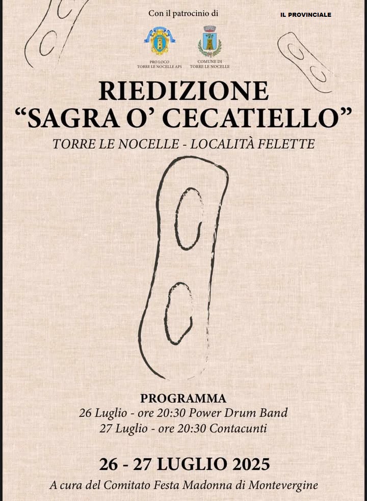 In programma il 26 e 27 luglio nella suggestiva località Felette, la manifestazione torna sotto il patrocinio della Pro Loco Torre le Nocelle APS e del Comune, riportando in auge una delle sagre più amate del territorio. Il cecatiello, formato di pasta tipico della cucina contadina campana, sarà ancora una volta protagonista di due serate all’insegna del gusto, della convivialità e della musica.