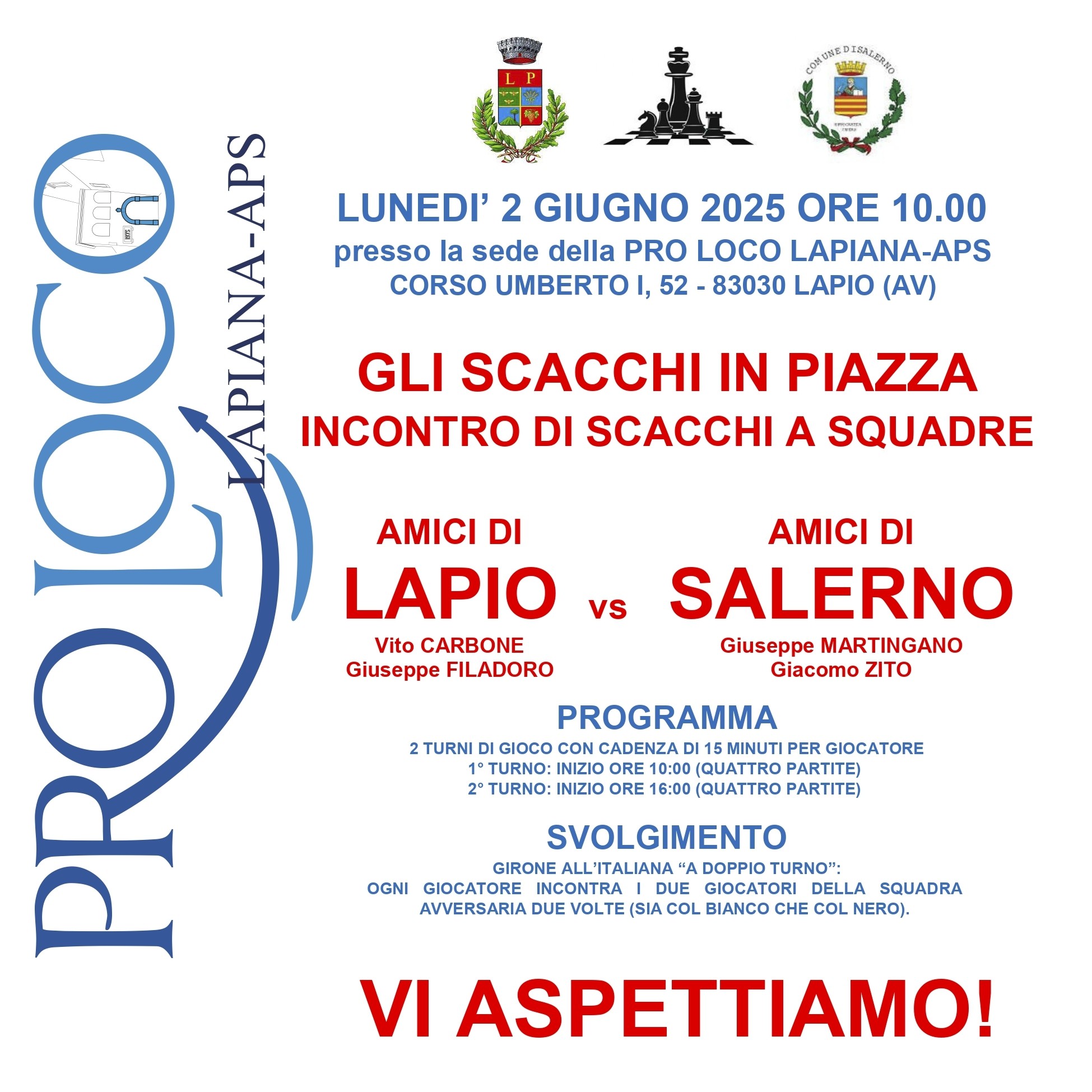Lunedì 2 giugno, a partire dalle ore 10:00, il comune di Lapio ospiterà l’evento 'Gli Scacchi in Piazza – Incontro di scacchi a squadre', promosso dalla Pro Loco Lapiana-APS presso la propria sede in Corso Umberto I. La manifestazione vedrà confrontarsi due compagini unite dalla medesima passione per il nobile gioco degli scacchi: la squadra degli 'Amici di Lapio', composta da Vito Carbone e Giuseppe Filadoro, e quella degli 'Amici di Salerno', rappresentata da Giuseppe Martingano e Giacomo Zito.