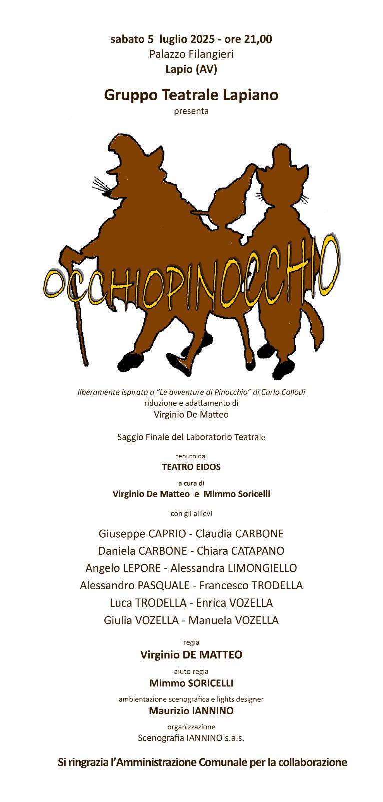 Sabato 5 luglio, alle ore 21.00, presso lo storico Palazzo Filangieri di Lapio, andrà in scena lo spettacolo teatrale 'Occhiopinocchio', messo in scena dal Gruppo Teatrale Lapiano.