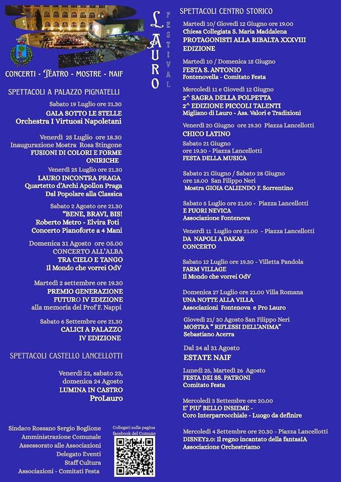 Prende il via il "Lauro Festival", il cartellone degli eventi estivi del Comune di Lauro, frutto del lavoro delle Istituzioni e delle Associazioni, dei soggetti privati e dei singoli artisti, riuniti in una rete di creatività e collaborazione.
