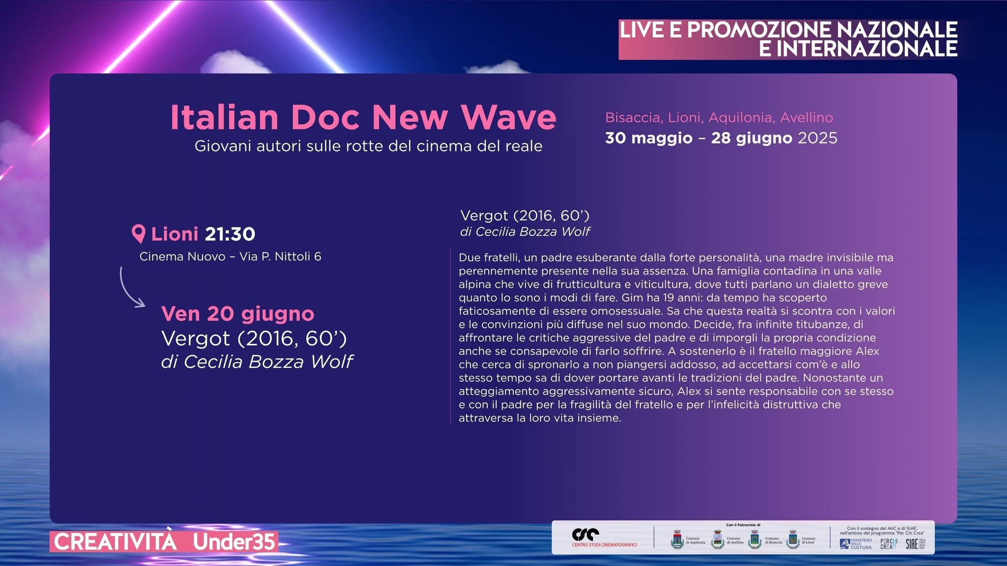 Il terzo appuntamento a Lioni presso il Multisala Cinema Nuovo, il 20 giugno alle ore 21.30 con  la proiezione di "Vergot" (2016, 60')  di Cecilia Bozza Wolf, pluripremiato film di diploma che la regista trentina ha realizzato al termine del proprio ciclo di studi alla ZeLIG School for Documentary, Television and New Media, una delle principali scuole di cinema documentario italiane.