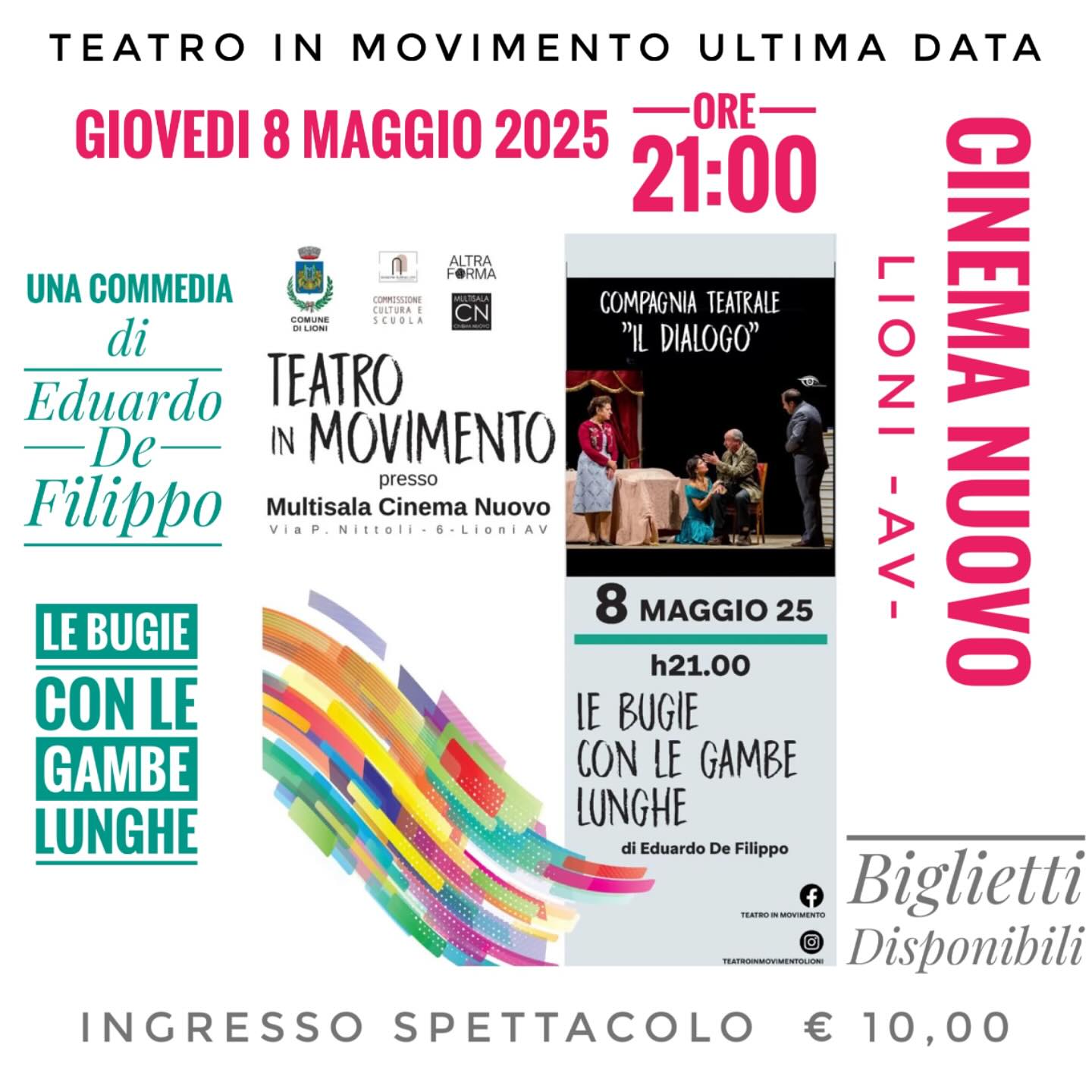 La compagnia teatrale “Il Dialogo” porta in scena, giovedì 8 maggio 2025 alle ore 21.00, presso il Multisala Cinema Nuovo di Lioni, la commedia di Eduardo De Filippo “Le bugie con le gambe lunghe”.
