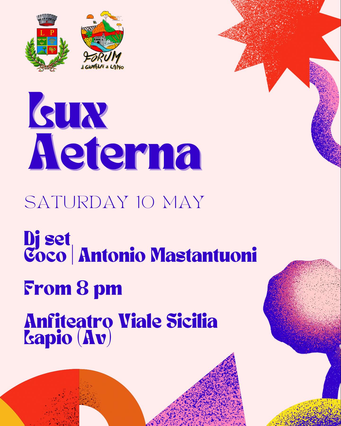 Sabato 10 maggio Lapio si trasforma in palcoscenico di luce e suono con Lux Aeterna, l’evento musicale che animerà l’Anfiteatro di Viale Sicilia a partire dalle ore 20.00.