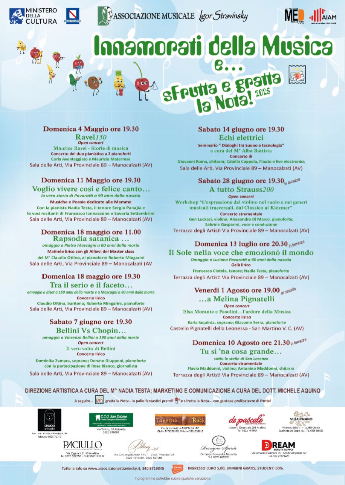 ‘Innamorati della Musica e… sFrutta e grattala Nota! 2025’ è la rassegna musicale promossa dall’Associazione musicale Igor Stravinsky con il patrocinio del Ministero della Cultura e della Regione Campania, un progetto culturale che unisce educazione, spettacolo e promozione della sana alimentazione attraverso il linguaggio universale della musica.