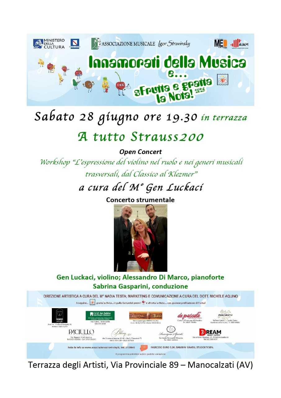 Tra gli appuntamenti in programma, spicca l’evento 'A tutto Strauss200', previsto per sabato 28 giugno alle ore 19.30 presso la Terrazza degli Artisti a Manocalzati, che propone un open concert e un workshop curato dal Maestro Gen Llukaci dal titolo 'L’espressione del violino nel ruolo e nei generi musicali trasversali, dal Classico al Klezmer'.