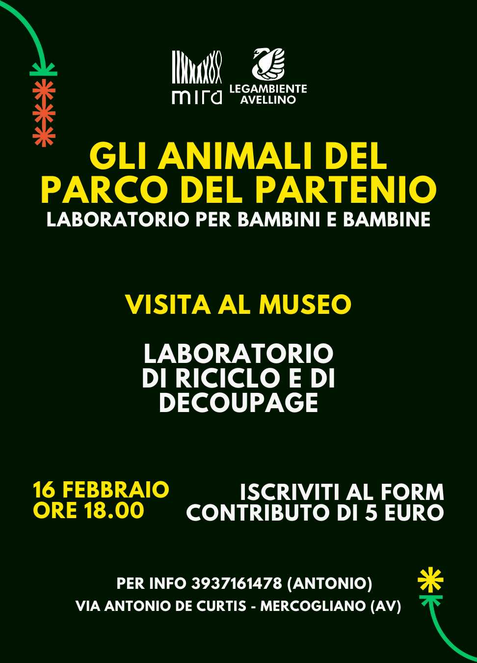 Il Museo M.I.R.A di Mercogliano, domenica 16 febbraio alle ore 18:00 ospita un evento organizzato da Legambiente Avellino-Alveare, il laboratorio "Gli animali del parco del partenio".