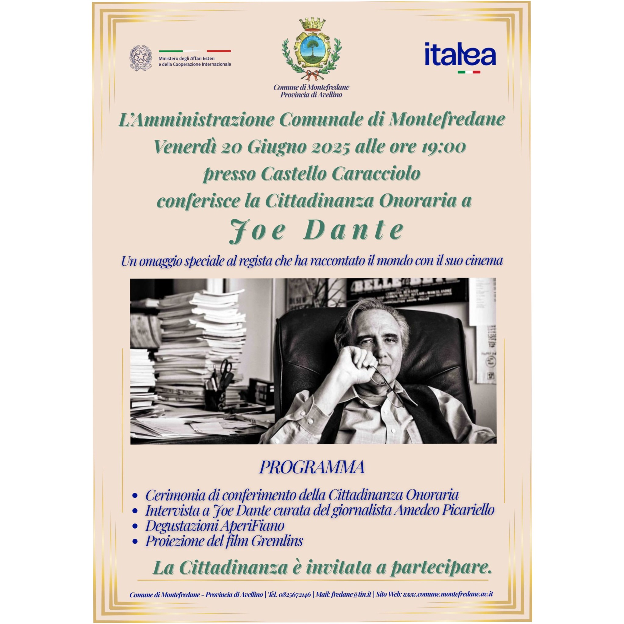 L’Amministrazione Comunale di Montefredane presenterà la cerimonia di conferimento della Cittadinanza Onoraria al regista statunitense Joe Dante, autore di cult cinematografici che hanno segnato la storia del cinema, tra cui Gremlins, Piranha, The ‘Burbs e Small Soldiers.