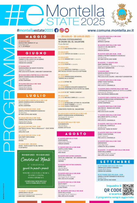 "Montella Estate 2025" è pronta a regalare grosse emozioni e divertimento. Il programma, organizzato dal Comune altirpino in collaborazione con Pro Loco, Forum dei Giovani, associazioni e attività locali, partito a Maggio con "Musica per i Borghi", sarà intenso e per tutte le fasce di età. Quattro mesi, si chiuderanno i battenti il 6 Settembre 2025, in cui si sposeranno tradizione, cultura, sport, natura, gastronomia, musica e tante altre attività. Convivio al Monte, giunto alla sua quinta edizione, uno degli eventi più attesi, i solenni festeggiamenti in onore del Santissimo Salvatore regalerà un vasto repertorio musicale ospitando, tra gli altri, Michele Zarrillo e Giusy Ferreri, tanto gusto con la Festa delle Stese, la Festa della Pizza, lo Street Food Festival, la Festa del Cavatello e la Festa della Birra, risate a crepapelle con Biagio Izzo nel giorno in cui ricorre San Rocco, escursionismo e altro ancora con Ama Camping 2025 e La Mangialonga Estiva, serate di osservazione astronomica. Insomma, un'estate da non perdere ai piedi del Monte Terminio, lo spettacolare scenario e il dolce clima della bella stagione renderanno l'atmosfera unica e indimenticabile.
