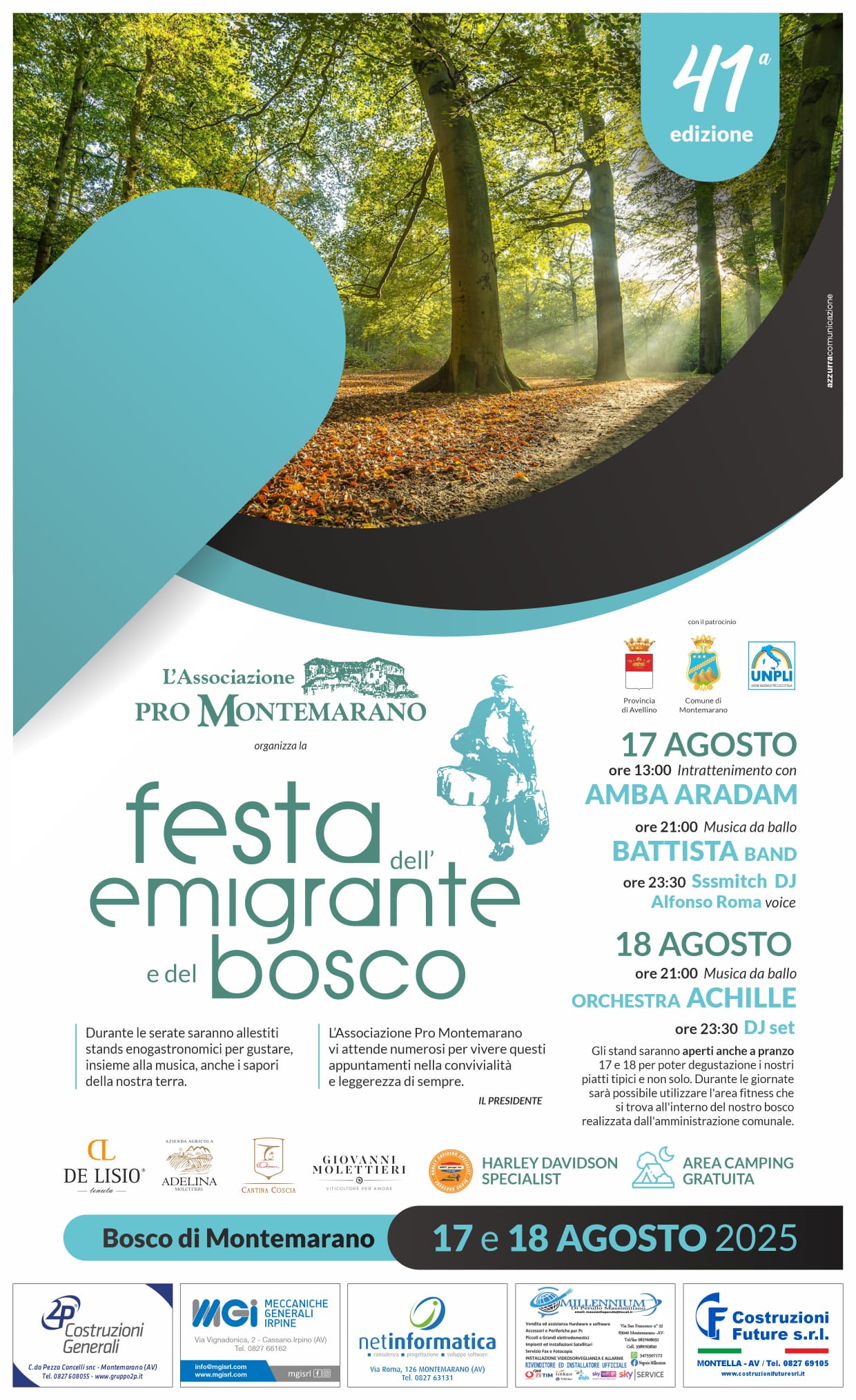 Tutto pronto per la 41ª edizione della “Festa dell’Emigrante e del Bosco”, in programma il 17 e 18 agosto nel Bosco di Montemarano. Un evento tradizionale che unisce la bellezza della natura alle radici della comunità. Come da tradizione, non mancheranno attività, degustazioni di prodotti tipici e spettacoli folkloristici.