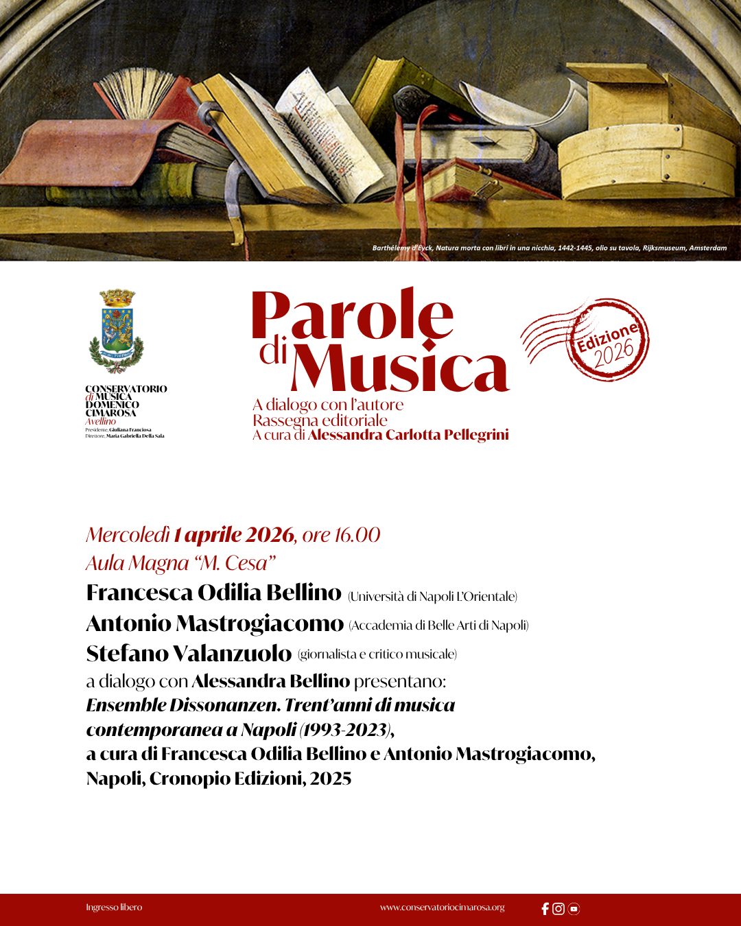 Ritorna la rassegna editoriale "Parole di Musica" mercoledì 1 aprile al Conservatorio Domenico Cimarosa di Avellino, presso l’Aula Magna "M. Cesa" - alle ore 16.00, per un incontro dedicato alla scena contemporanea napoletana.