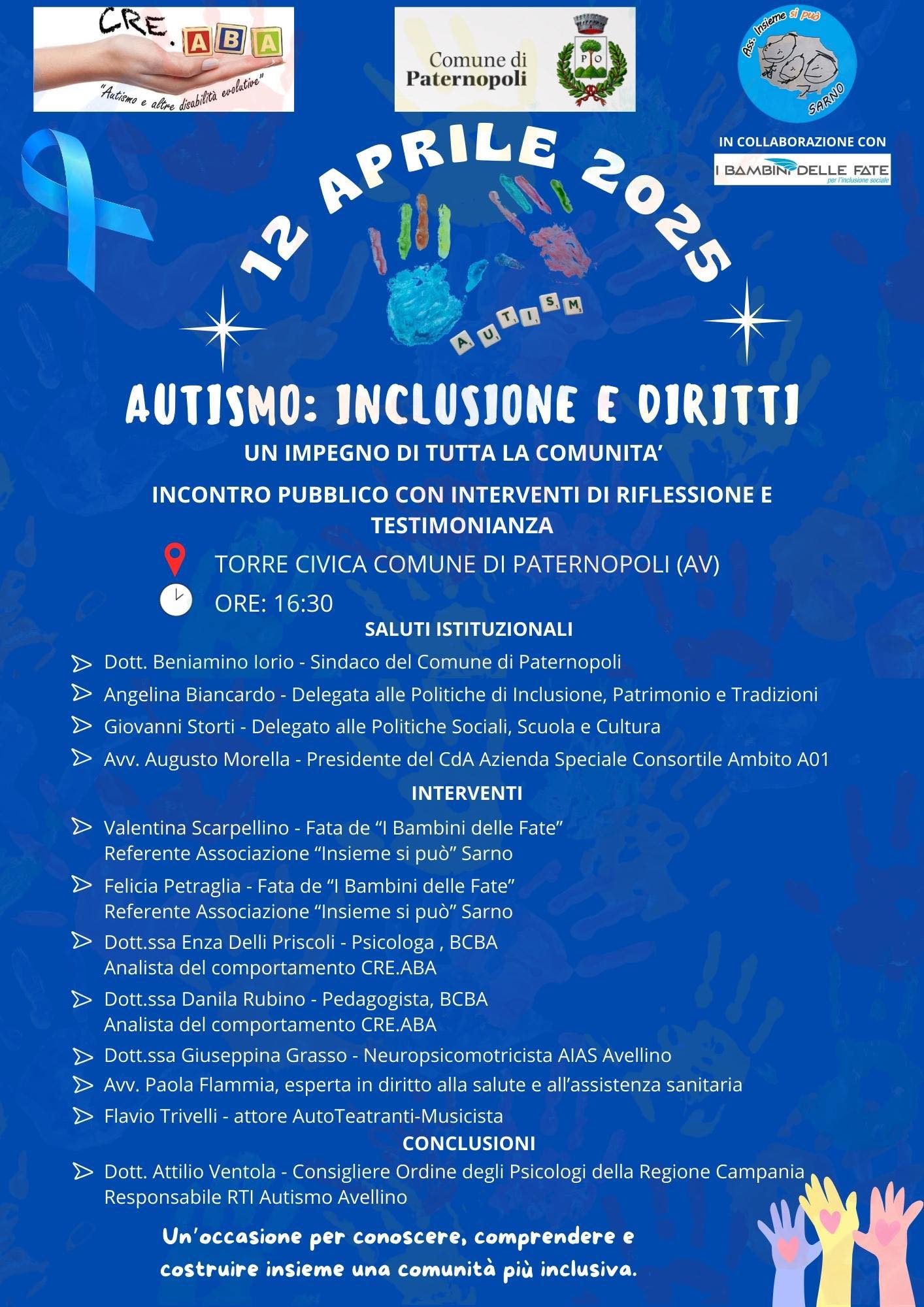 Sabato 12 aprile, alle ore 16.30, la Torre Civica di Paternopoli ospiterà un evento pubblico dedicato all’autismo, dal titolo 'Autismo: Inclusione e Diritti – Un impegno di tutta la comunità'.
