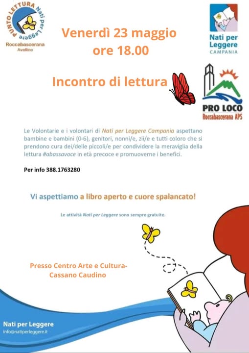 Venerdì 23 maggio presso il Centro Arte e Cultura di Cassano Caudino, frazione di Roccabascerana "Incontro di lettura" per bambini nella fascia d'età 0-6 anni.