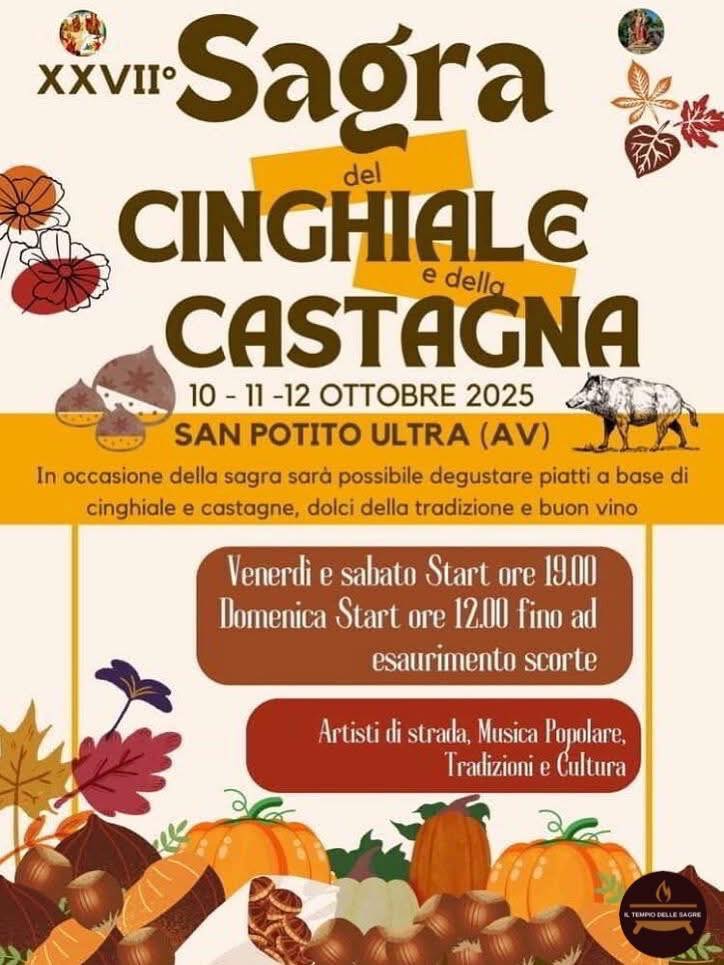 Torna l'atteso appuntamento con la “Sagra del Cinghiale e della Castagna” arrivata ormai alla sua XXVII° edizione, presso il borgo di San Potito Ultra.