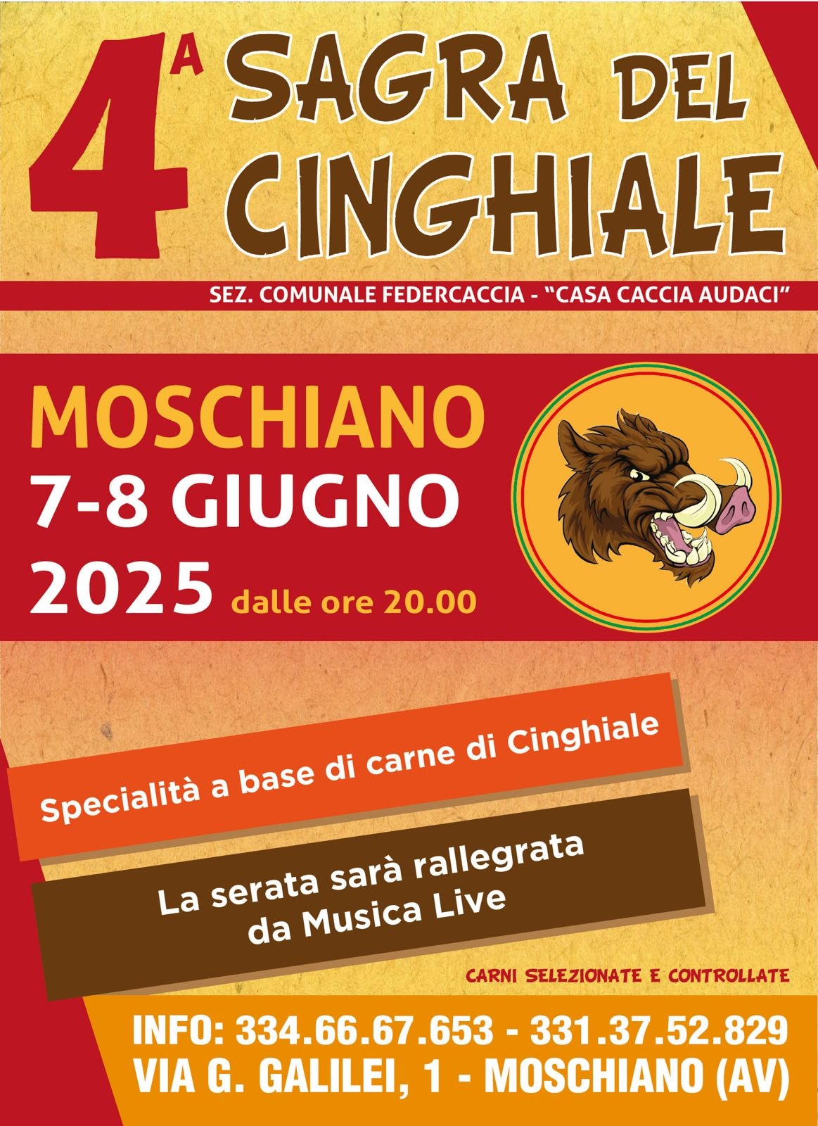 Anche quest'anno si rinnova a Moschiano l’appuntamento con la "Sagra del Cinghiale", tradizionale evento che celebra il cinghiale, diventato un appuntamento fisso per tutti gli amanti della gastronomia e delle tradizioni locali.