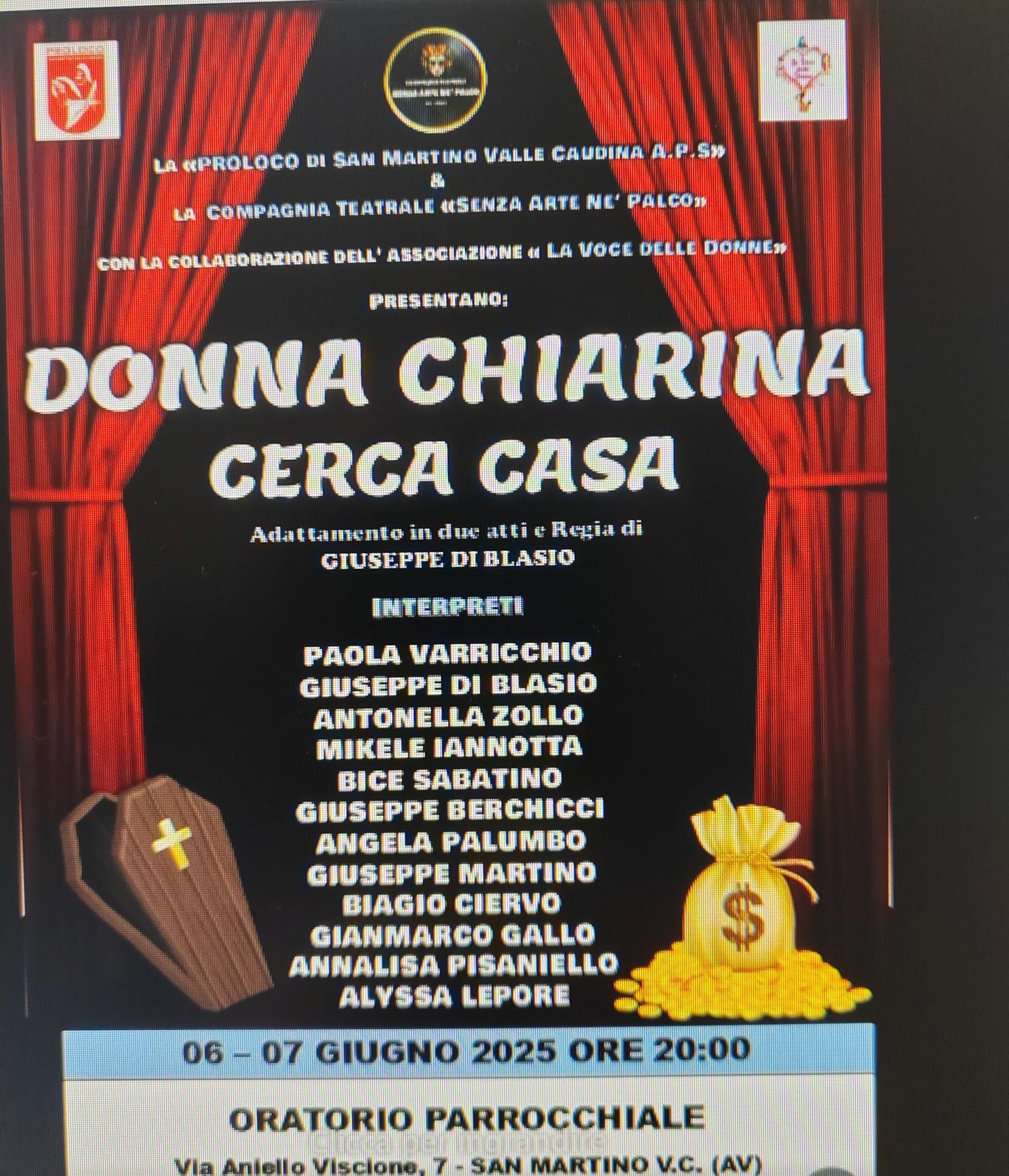 Venerdì 6 e sabato 7 giugno, presso l'Oratorio parrocchiale di San Martino Valle Caudina si terrà lo spettacolo teatrale "Donna Chiarina cerca casa". L'evento è organizzato dalla Pro Loco cittadina in collaborazione con l'Associazione "La Voce delle Donne"