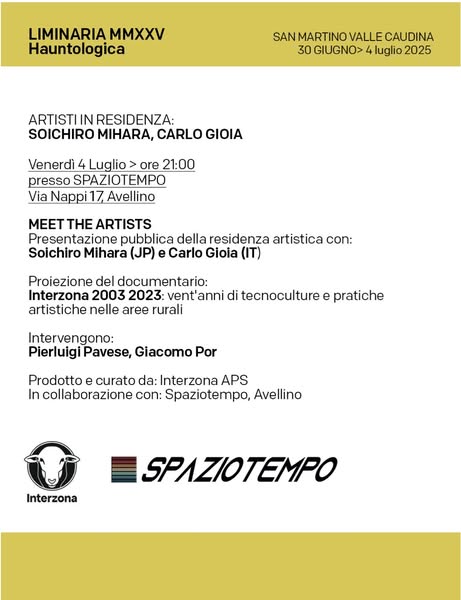 Dal 30 giugno al 4 luglio San Martino Valle Caudina ospita la residenza artistica internazionale "Liminaria MMXXV-Hauntologica", Soichiro Mihara, artista giapponese e Carlo Gioia originario di Potenza, impegnati in una ricerca sul territorio, esploreranno il Torrente Caudino, interpretando la sua dinamica evolutiva.