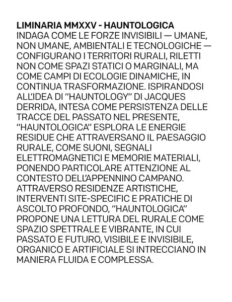 Nel progetto "Liminaria MMXXV-Hauntologica" si guarda alla configurazione dei territori rurali intesi non come spazi statici o marginali ma come campi di ecologie dinamiche in perenne trasformazione, si esplorano le energie che emana il paesaggio attraverso momenti di ascolto della natura.