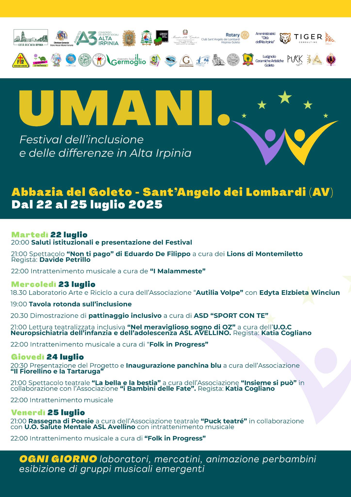 Dal 22 al 25 luglio l’Abbazia del Goleto di Sant’Angelo dei Lombardi ospiterà "Umani", il festival dell’inclusione e delle differenze in Alta Irpinia. Un’iniziativa di rete, un punto. Per affermare, non spiegare. Perché non c’è nulla da dimostrare quando si parla di dignità, accoglienza, relazione. Il festival nasce per creare spazi in cui l’umanità sia praticata, educata, ricordata. Un tempo condiviso in cui ascoltare, guardare, toccare con mano la ricchezza delle differenze. Un invito collettivo a riconoscersi e riconoscere l’altro, oltre ogni etichetta, oltre ogni confine.