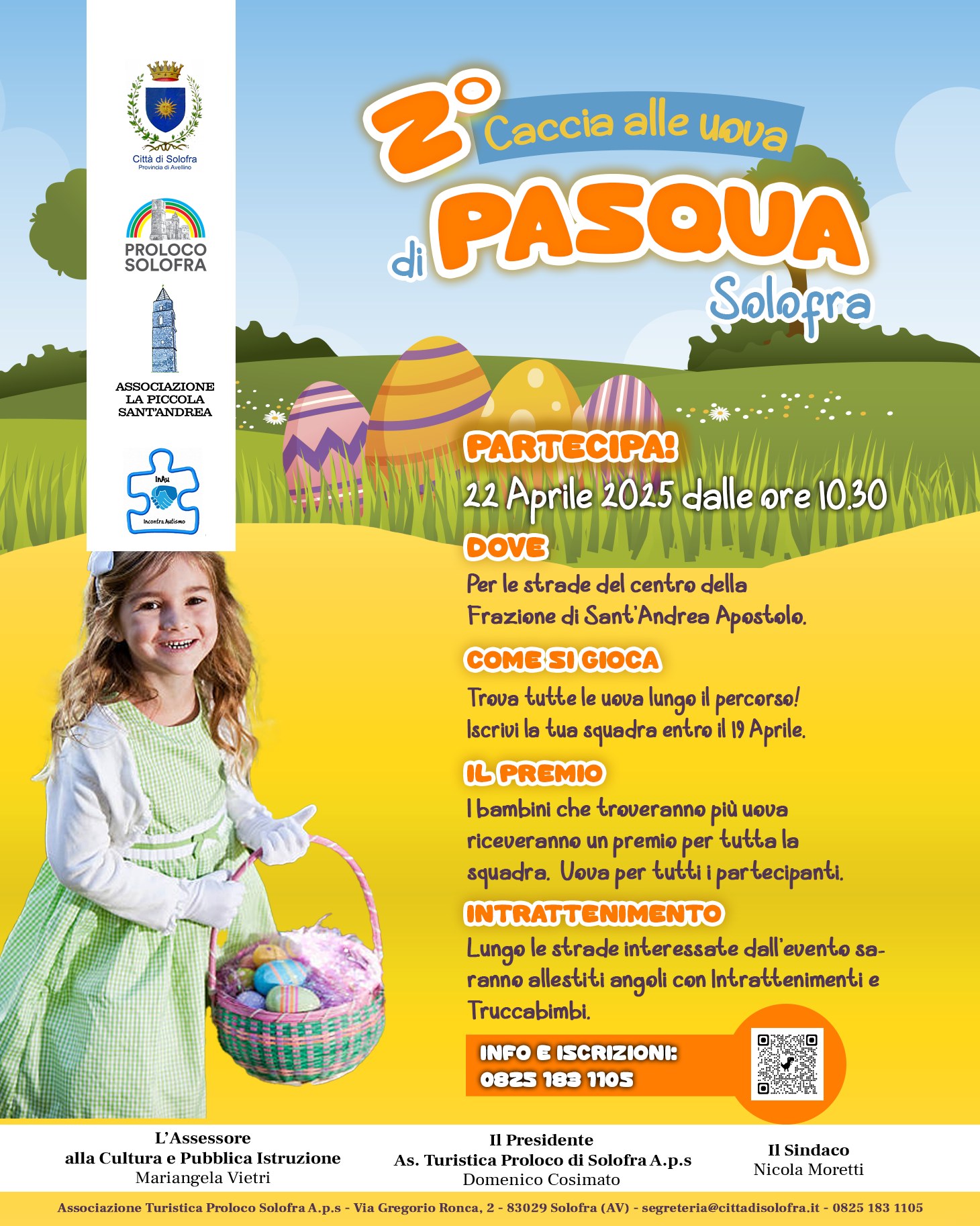 Anche quest’anno ritorna a Solofra la tanto attesa "Caccia alle Uova di Pasqua", divertente iniziativa rivolta ai più piccoli e alle loro famiglie, promossa dalla Pro Loco di Solofra A.p.s, in collaborazione con l’Associazione "La Piccola Sant’Andrea" e con il patrocinio del Comune di Solofra.