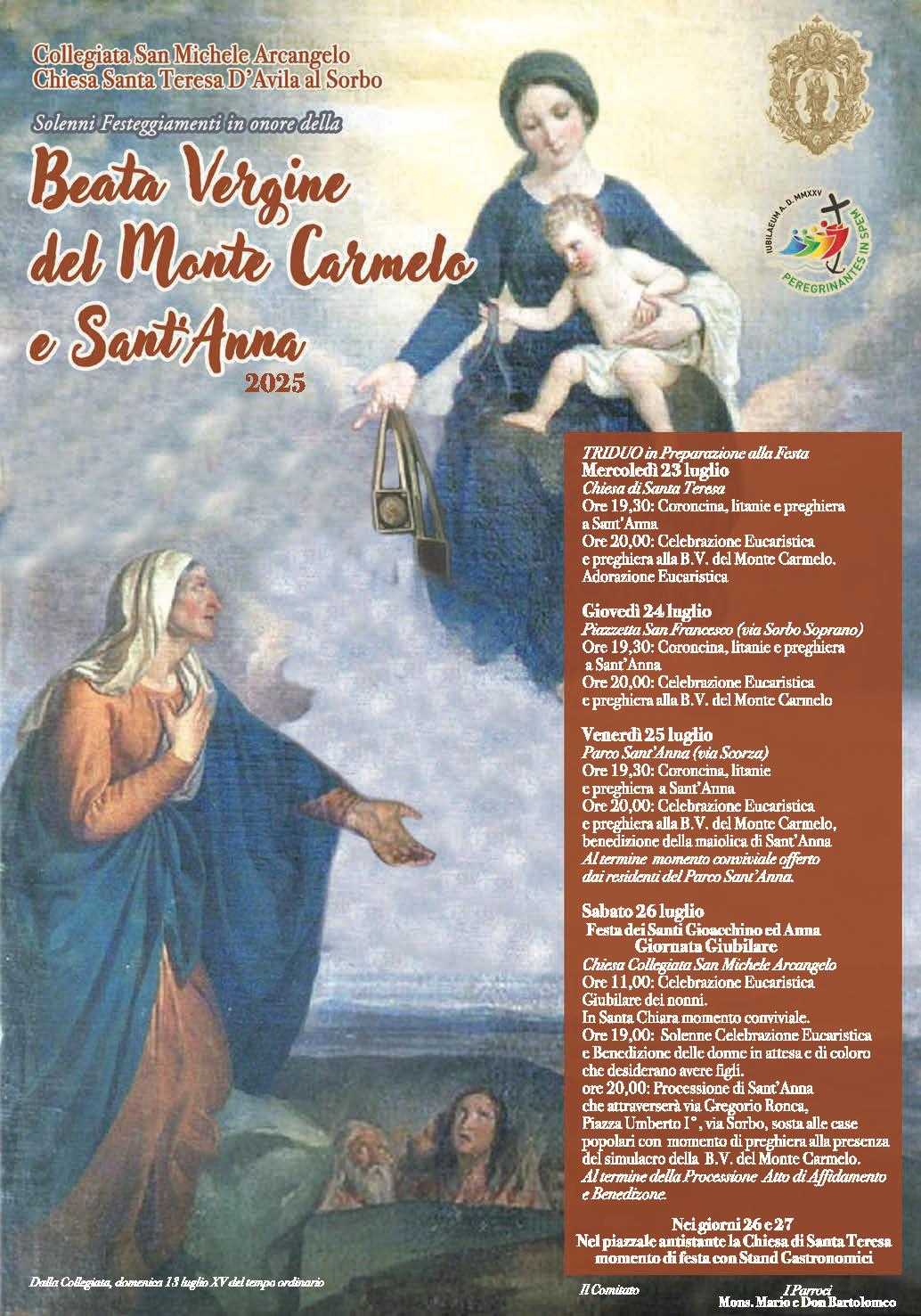 In serata, nella Collegiata di San Michele Arcangelo, si terrà la Solenne Celebrazione Eucaristica alle ore 19:00 con la benedizione delle donne in attesa e dei bambini, a cui seguirà la tradizionale processione dei simulacri della Madonna del Carmelo e di Sant'Anna che, in occasione dell'Anno Giubilare, partirà proprio dalla Collegiata di San Michele per giungere fino alla Chiesa di Santa Teresa al Rione Sorbo, attraversando le strade del centro tra preghiere e un forte sentimento comunitario.