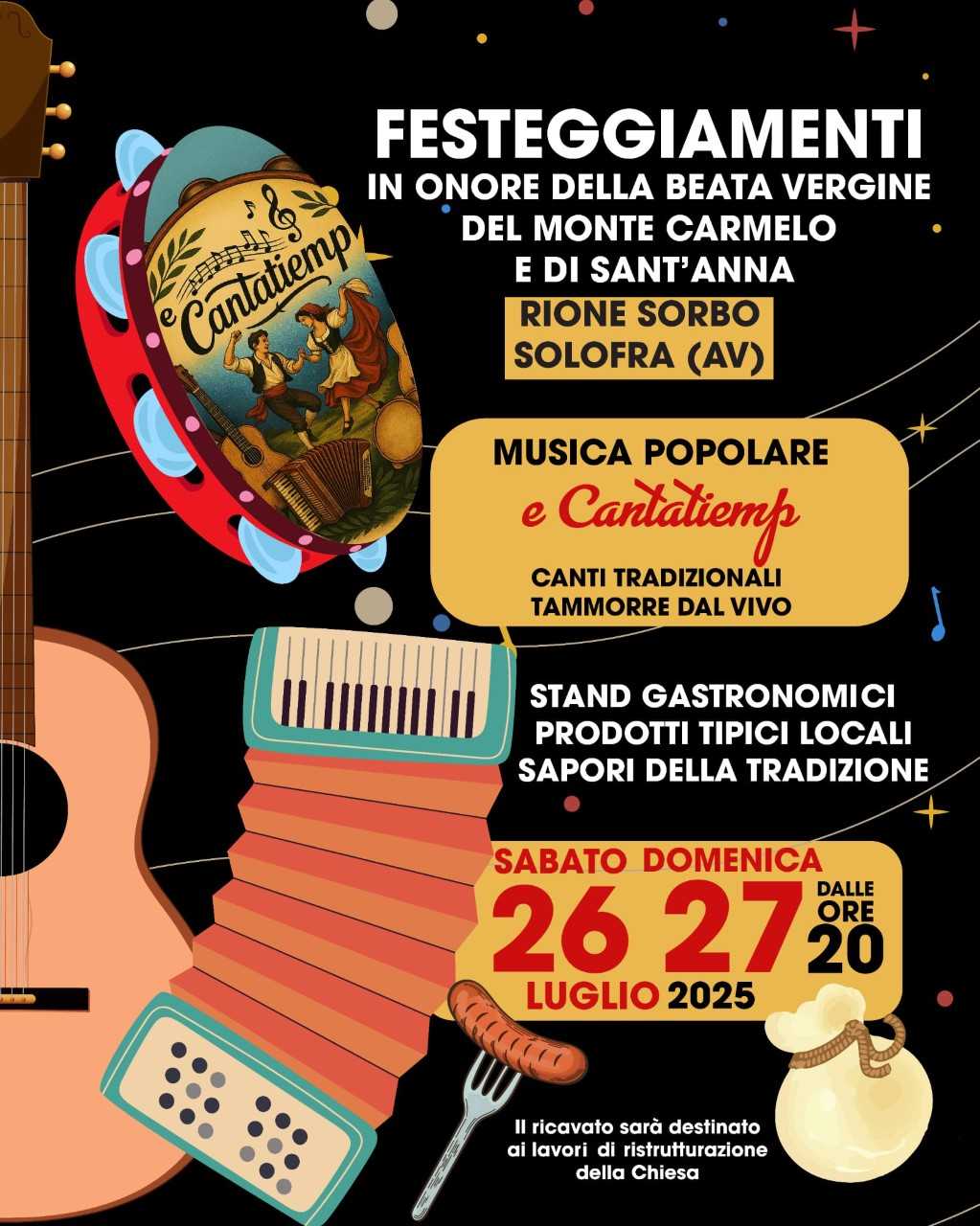 Il programma civile, che coinvolge tutto il rione, si aprirà entrambe le sere a partire dalle ore 20:00 con stand gastronomici dedicati ai prodotti tipici della tradizione locale e spettacoli musicali dal vivo. Protagonista della festa sarà il gruppo "Cantatiemp", che animerà il pubblico con canti popolari, tammorre e danze che richiamano l’anima profonda del Sud.
