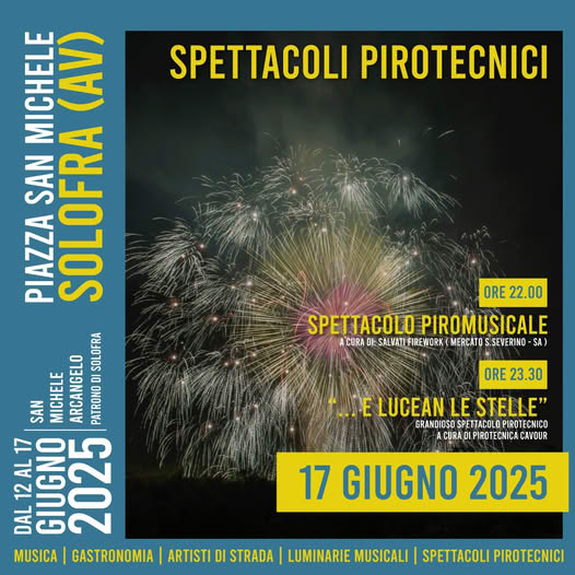 Gran finale Martedì 17 Giugno con il "Festival degli artisti di strada", uno scenografico show piromusicale in Piazza San Michele, seguito dallo spettacolo pirotecnico “…E lucean le Stelle” in località Pastena.