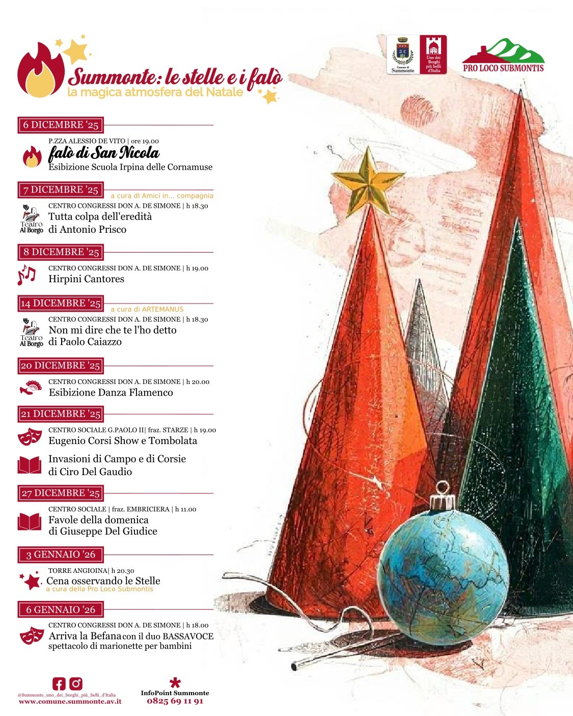 Summonte si prepara a vivere la magia del Natale con un calendario ricco di appuntamenti, tradizioni e spettacoli. Il programma, organizzato dal Comune e dalla Pro Loco Submontis, animerà tutto il periodo festivo fino al 6 gennaio 2026, coinvolgendo adulti e bambini in un’atmosfera calda, accogliente e profondamente legata alle tradizioni locali.