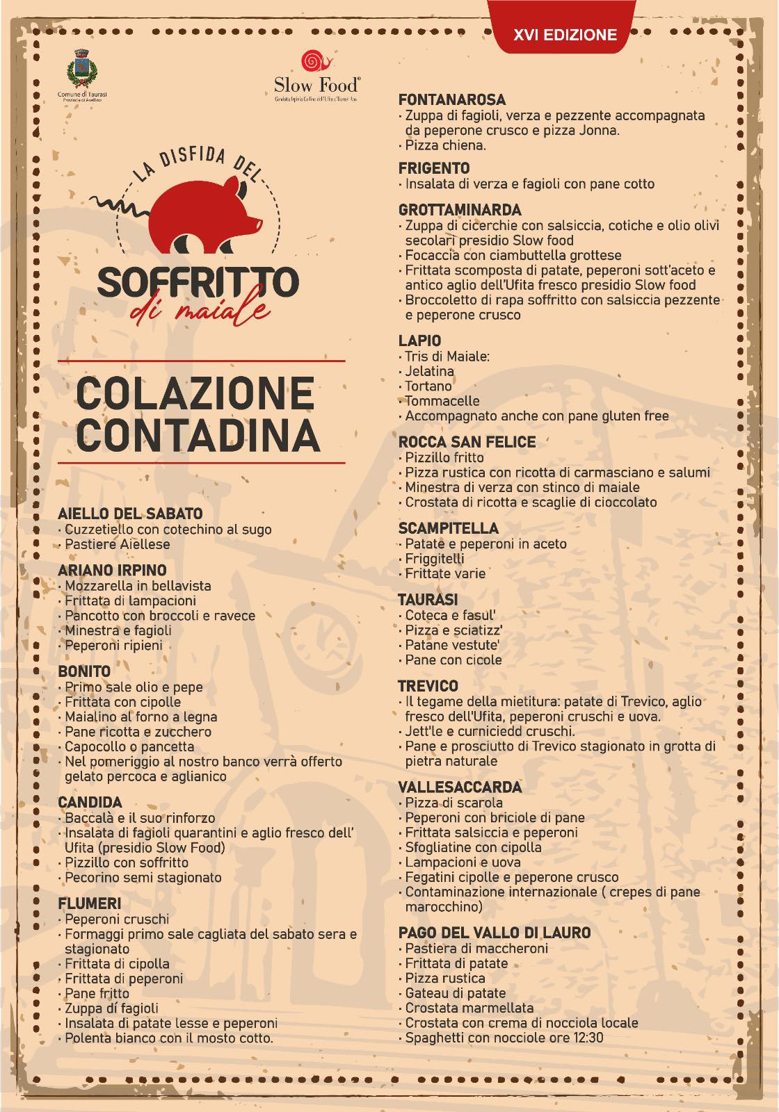 Il protagonista assoluto sarà il “soffritto” — o ’o suffritt, la celebre zuppa a base di frattaglie di maiale (fegato, cuore, polmone, milza e trachea), simbolo delle aree interne tra Irpinia e napoletano, preparato secondo ricette tramandate di generazione in generazione.