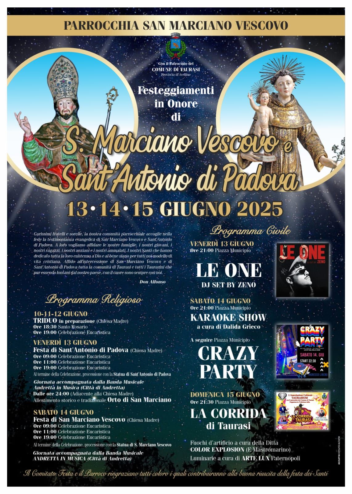 Dal 13 al 15 giugno il borgo di Taurasi è in festa per la celebrazione di S. Marciano Vescovo e S.Antonio da Padova, al ricco programma religioso si affianca un entusiasmante programma civile in cui sarà principalmente la musica a smuovere gli animi, la Banda Musicale "Andretta in Musica" accompagnerà i riti liturgici, di sera si lascerà il passo al divertimento con tre imperdibili spettacoli.