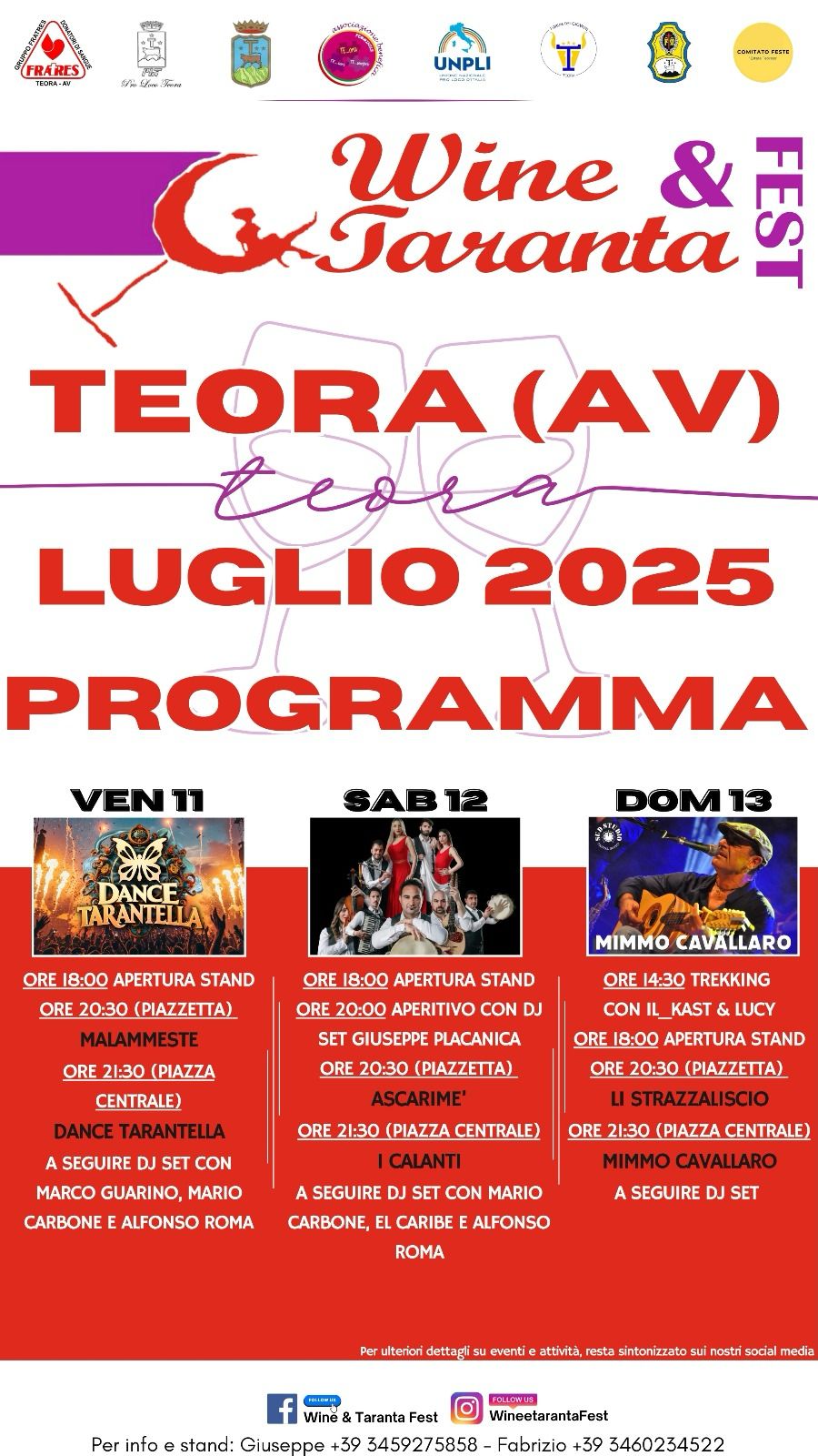 Il Festival, Wine & Taranta Fest, promosso dal Comune di Teora e dalla Pro Loco, con la collaborazione di numerose associazioni locali, è pensato come un vero e proprio viaggio esperienziale tra cultura, gastronomia e spettacolo, dove l’energia della taranta incontra l’autenticità delle tradizioni irpine.