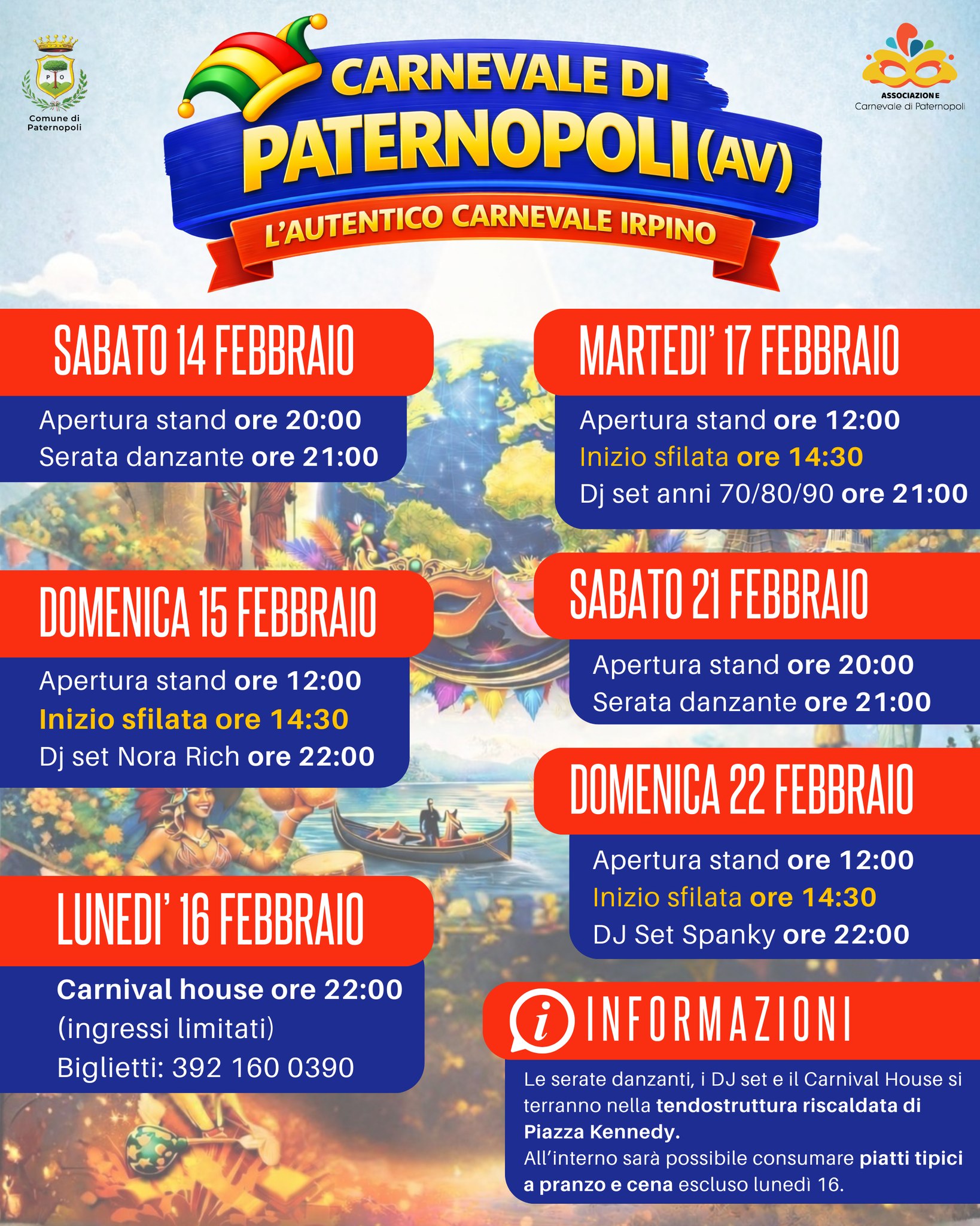 Le serate danzanti, i DJ set e il Carnival House si svolgeranno nella tendostruttura riscaldata di Piazza Kennedy, garantendo comfort e divertimento in ogni condizione. All’interno sarà possibile degustare piatti tipici della tradizione paternese sia a pranzo che a cena, ad eccezione di lunedì 16.