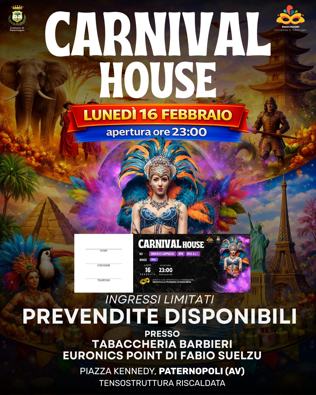 Il divertimento continuerà lunedì 16 febbraio con il Carnival House, in programma alle ore 22:00 (ingressi limitati).