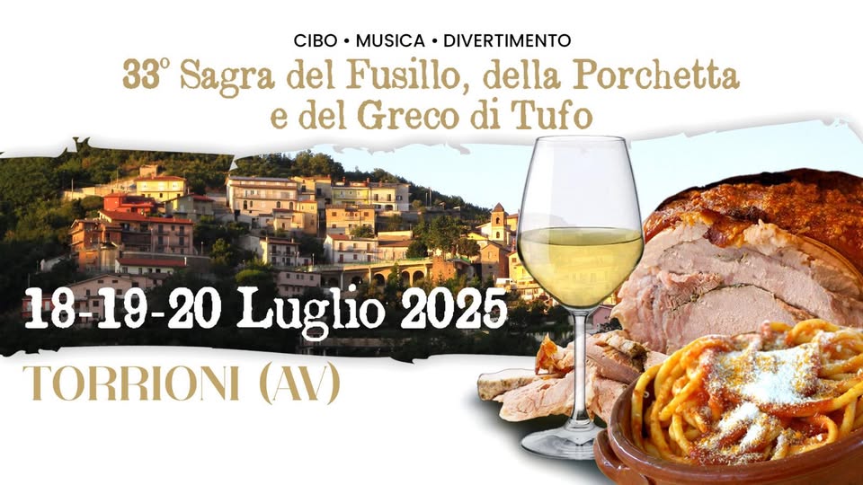 Dal 18 al 20 luglio Torrioni è in festa con la "Sagra del Fusillo, della Porchetta e del Greco di Tufo" un omaggio alle tradizioni culinarie del posto, siamo all'edizione n°33, una festa consolidata che ogni anno rinnova l'entusiasmo verso le specialità enogastronomiche locali.
