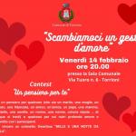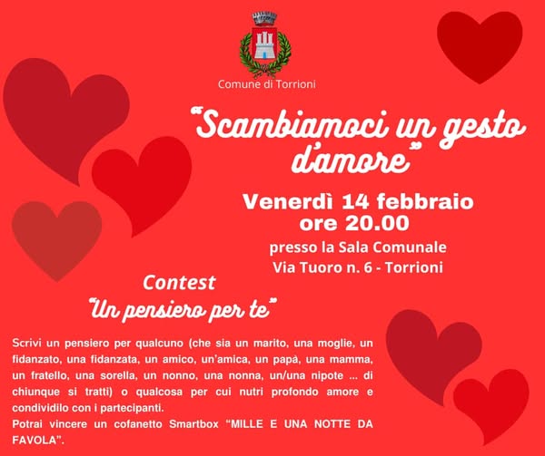 Venerdì 14 febbraio, nella Sala comunale di Torrioni, l'evento "Scambiamoci un gesto d'amore", protagonista della serata di San Valentino sarà "l'amore dato" non conta a chi o cosa ma il sentire quel nobile sentimento che ci spinge ad essere la versione migliore di noi stessi.