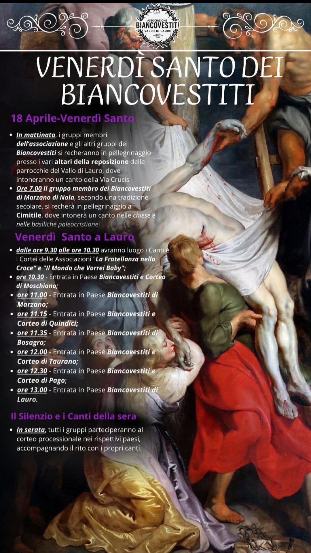 I gruppi membri dell'Associazione e gli altri gruppi dei Biancovestiti si recheranno in pellegrinaggio presso i vari altari della reposizione delle parrocchie del Vallo di Lauro, dove intoneranno un canto della Via Crucis
