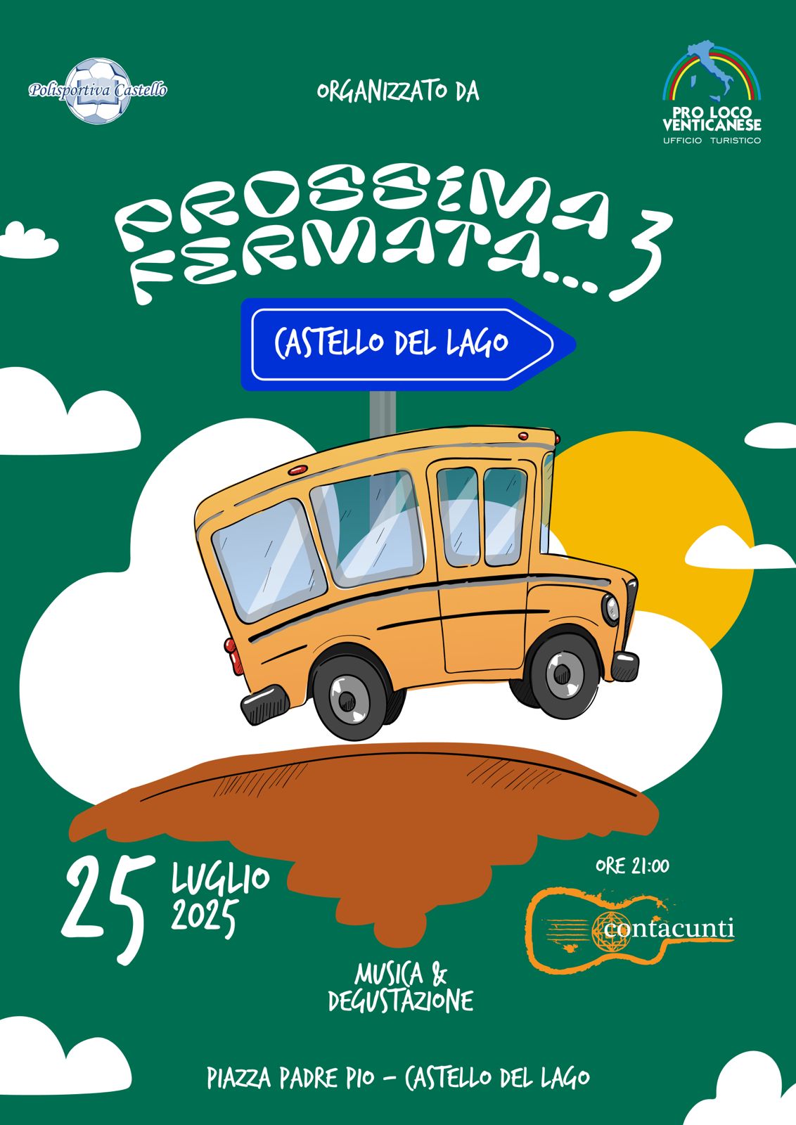 Il prossimo evento in programma si terrà venerdì 25 luglio, a partire dalle ore 21.00, in Piazza Padre Pio a Castello del Lago, con la terza edizione dell’evento ‘Prossima Fermata…’. Promossa dalla Polisportiva Castello e dalla Pro Loco Venticanese, l’iniziativa propone un itinerario enogastronomico dedicato alla valorizzazione dei sapori locali, con degustazioni a cura delle attività del territorio.