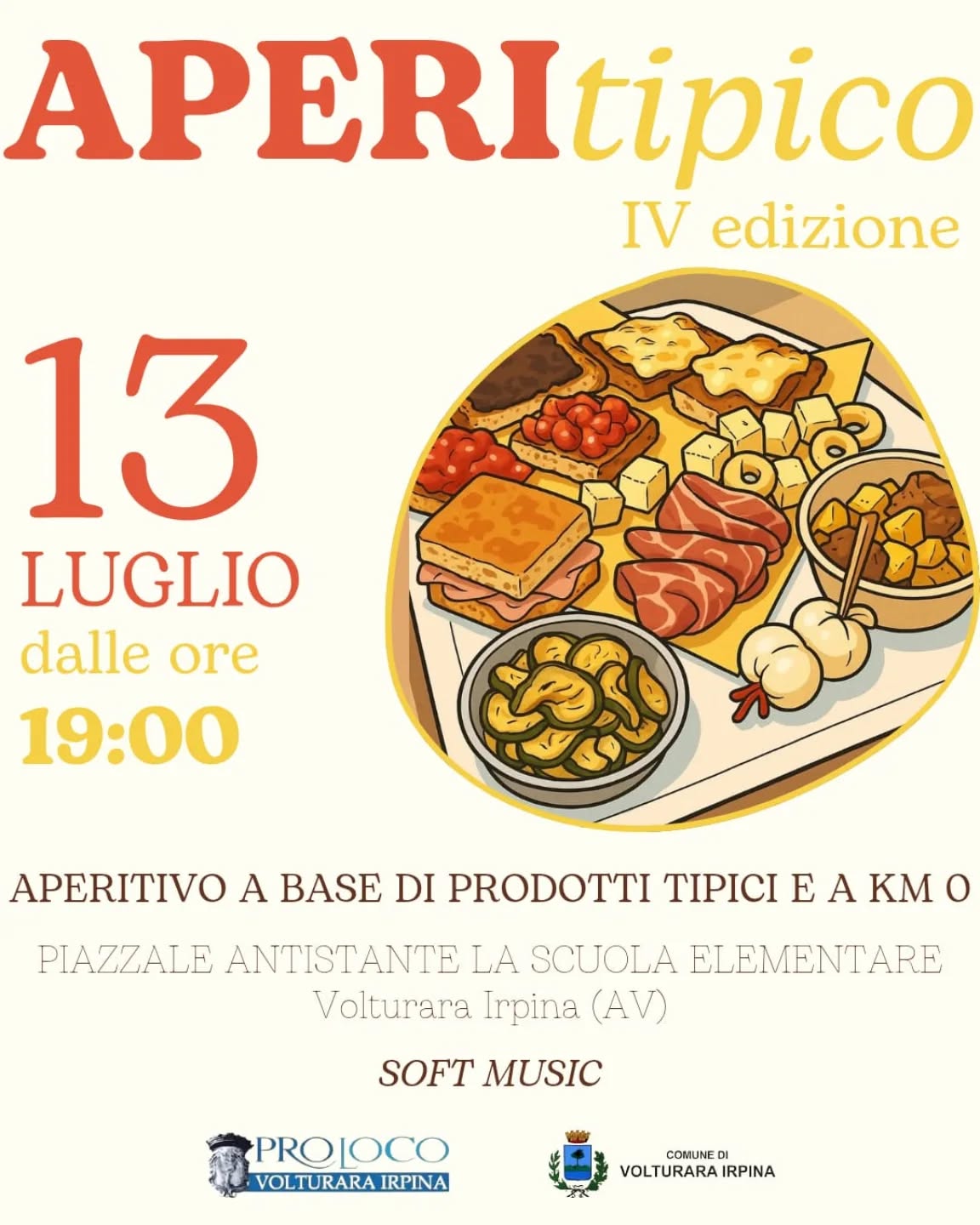 L'appuntamento domenica 13 luglio, alle ore 19.00,nel piazzale antistante la scuola elementare di Viale Rimembranza a Volturara Irpina, con la IV edizione di “Aperitipico”, l’evento che celebra i sapori autentici dell’Irpinia con un aperitivo a base di prodotti tipici e a Km 0.