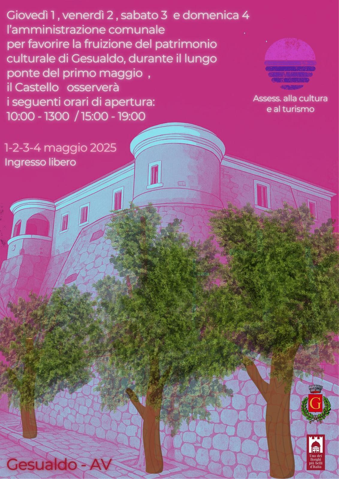 Per favorire la fruizione del patrimonio culturale di Gesualdo, in occasione del ponte del 1° Maggio, il Castello di Gesualdo sarà visitabile, con ingresso libero, nei giorni 1, 2, 3 e 4 Maggio, dalle ore 10:00 alle 13:00 e dalle 15:00 alle 19:00.