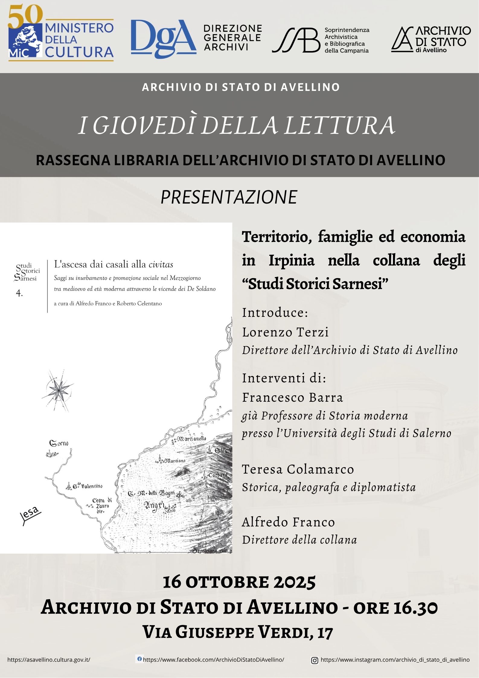 Giovedì 16 ottobre, alle ore 16:30, si terrà un nuovo appuntamento della rassegna libraria dell’Archivio di Stato di Avellino con la presentazione della collana editoriale degli Studi Storici Sarnesi.